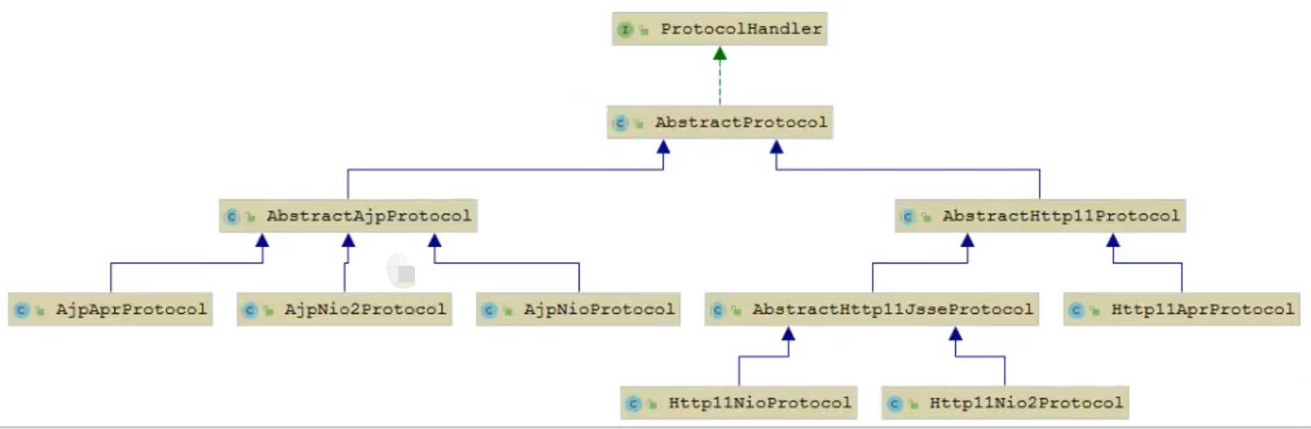 ProtocolHandler :coyote 协议接口,通过封装 EndPoint 和 Processor ,实现对具体协议的处理功能。Tomcat 安装协议和IO提供了6个实现类: