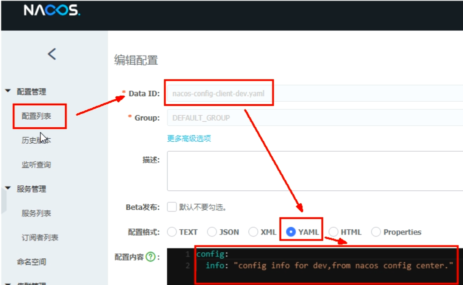 在对应的命名空间内添加配置,可以在不同的组创建配置。